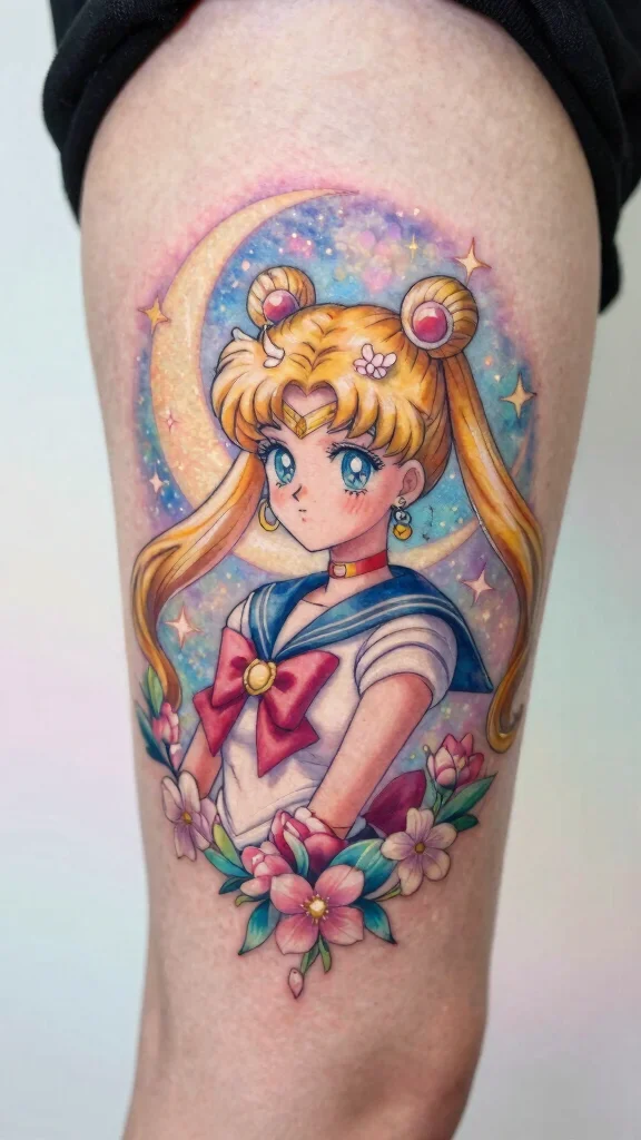 If you’re enchanted by Sailor Moon, a tattoo featuring the Moon Princess can be truly magical. Imagine soft pastel colors combined with elements like crescent moons, stars, and delicate flowers. This design not only showcases your love for the series but also adds a feminine touch to your leg.
