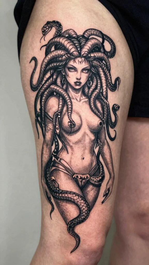 This tattoo will make a powerful statement, reflecting Medusa’s enigmatic nature.