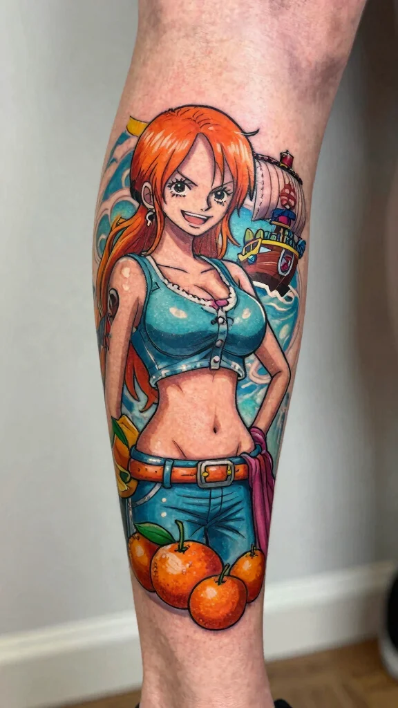 Nami’s vibrant personality makes her an ideal choice for a lively leg tattoo. Imagine her in her signature outfit, surrounded by the Thousand Sunny ship and tangerines, reflecting her adventurous spirit. This colorful design will bring energy to your leg.
