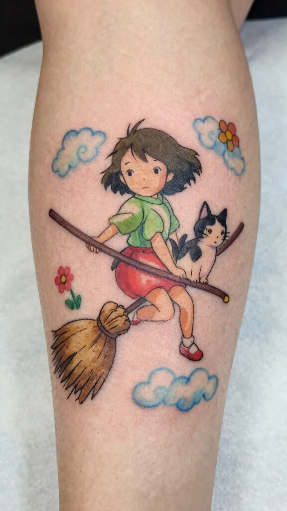 Kiki from Kiki’s Delivery Service embodies charm and independence, making her a delightful tattoo choice. Imagine her flying on her broom with Jiji, promoting a sense of adventure and magic. Soft colors like blues and yellows will enhance the cheerful vibe of the design.