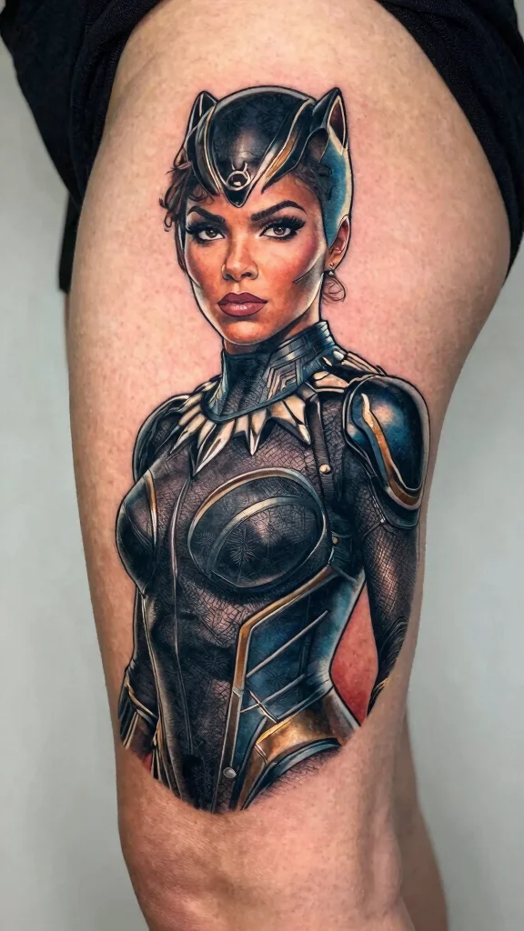 Highlight this tattoo on the outer thigh or calf for an expressive portrayal. Including elements like the Wakanda symbol can deepen the meaning behind the tattoo.
