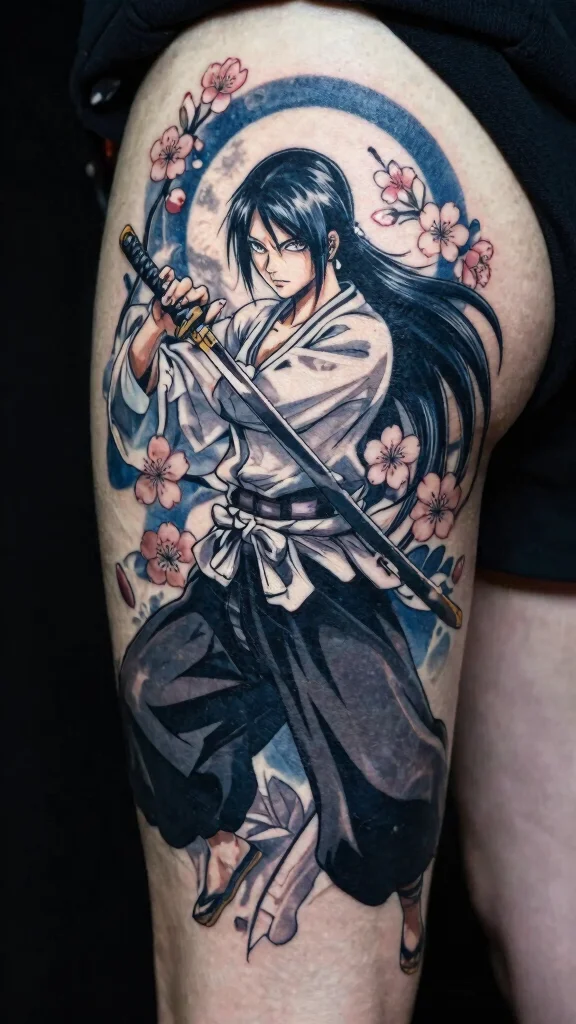 Rukia Kuchiki from Bleach is a character known for her strength and style, making her an excellent tattoo subject. Envision her in a battle stance, wielding her sword, surrounded by cherry blossoms or the moon. This design reflects her connection to the Soul Society.
