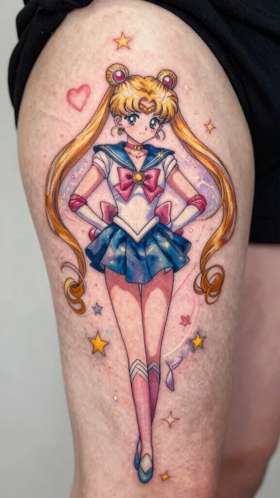 Think about placing this tattoo on your outer thigh to highlight its intricate details. You can incorporate Sailor Moon’s iconic pose and include symbols that resonate with you, such as quotes or imagery from the show.