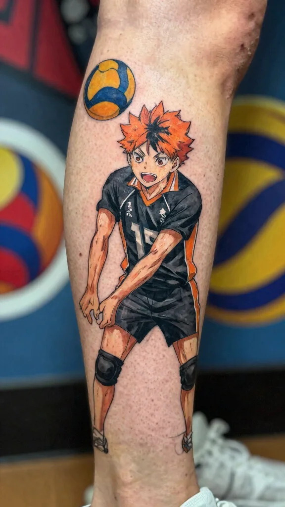 Hinata Shoyo has a strong presence that can be creatively depicted in a leg tattoo. Picture him in an action pose while playing volleyball, symbolizing determination and teamwork. This design can be bold, using vibrant colors to represent the energy of the game.