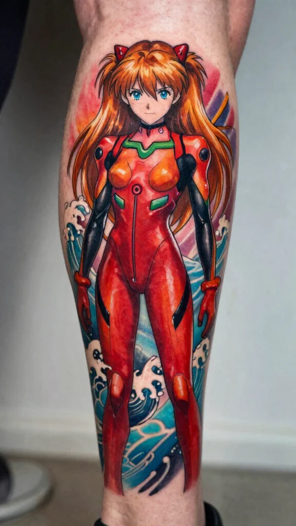 Asuka Langley Soryu’s fierce personality makes her an ideal tattoo choice for fans. Picture her in her striking pilot suit alongside Eva Unit-02, using vibrant reds and blacks to convey her strength. This design captures her determination and spirit perfectly.
