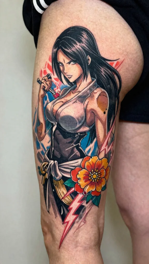 Yoruichi Shihouin, known for her blend of strength and elegance, makes a fantastic leg tattoo choice. Envision her in her iconic Shinigami form, showcasing her athletic build and fierce character. Elements like lightning or flowers can emphasize her connection to nature and power.