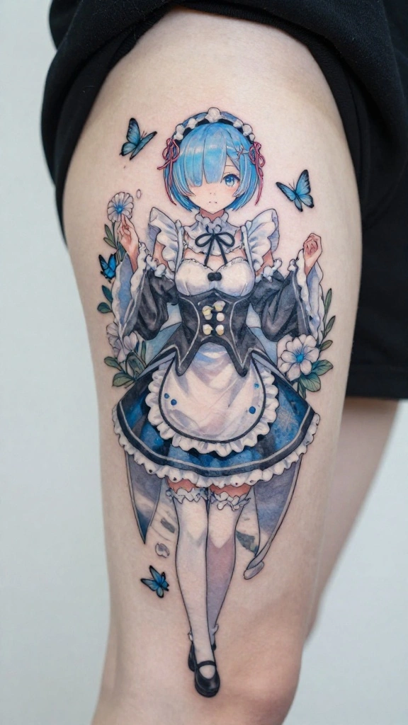 Rem’s sweet demeanor makes her a delightful tattoo choice. Imagine a whimsical design featuring her in soft blues and whites, adorned with flowers or butterflies. This tattoo can encapsulate her gentle spirit beautifully.