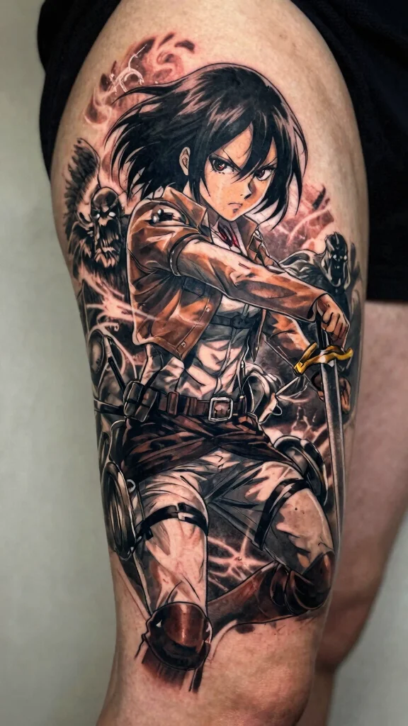 Mikasa Ackerman embodies strength and determination, making her a powerful tattoo choice. A design featuring her in a battle stance with her sword, surrounded by Titans or the Survey Corps symbol, reflects her fierce spirit.