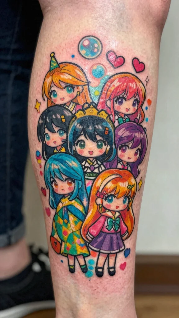 Chibi versions of your favorite characters bring a playful twist to leg tattoos. These vibrant designs can capture the essence of various anime characters in a fun way. Imagine a collection of chibi figures that symbolize your favorites or represent friendships.