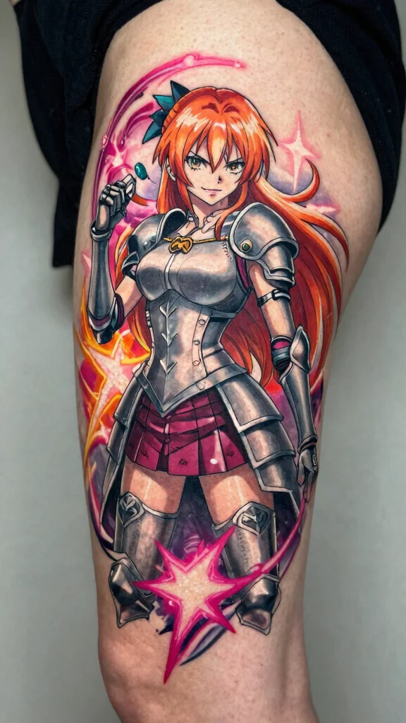 Erza Scarlet’s warrior spirit makes her a striking tattoo subject. Imagine her in iconic armor, surrounded by weapons, symbolizing strength and courage. This bold and colorful design can showcase intricate patterns in her armor.