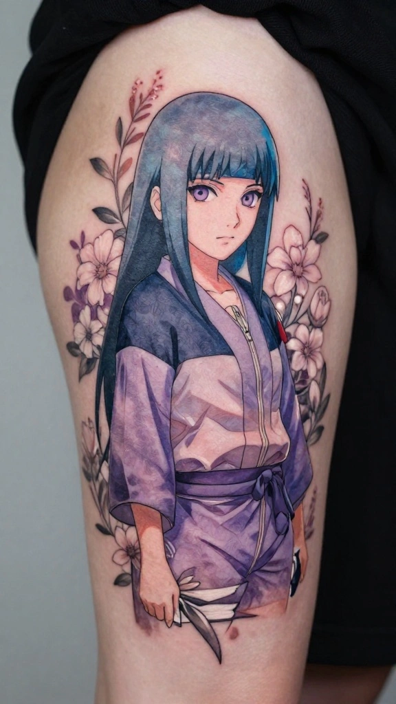 Hinata Hyuga embodies gentleness and strength, making her a beautiful tattoo choice. Imagine her in her iconic outfit with Byakugan eyes, surrounded by floral motifs symbolizing her growth. This design can be delicate and serene.