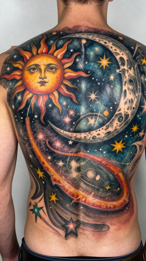 Celestial body tattoos, including the sun, moon, and stars, represent guidance, protection, and spirituality. These designs can create a stunning cosmic tableau across your back, reflecting your connection to the universe. Celestial tattoos often symbolize enlightenment, dreams, and life’s cycles.