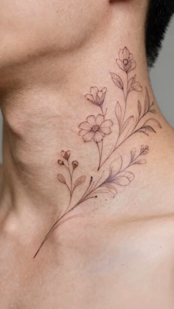 When opting for floral designs, think about the types of flowers that resonate with you personally. Placement is crucial; whether it’s a small sprig behind the ear or a larger piece wrapping around the neck, it should feel right. Keeping the design minimal allows for a masculine edge while still offering a touch of softness.
