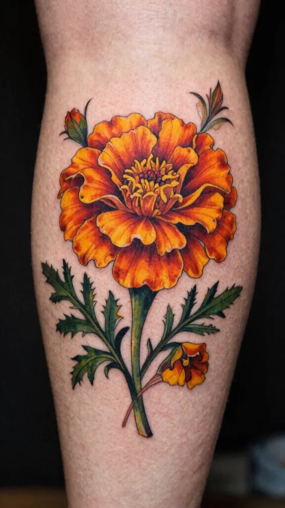 A marigold tattoo serves as a cheerful reminder to embrace your creative spirit, brightening your leg with its vibrant energy.