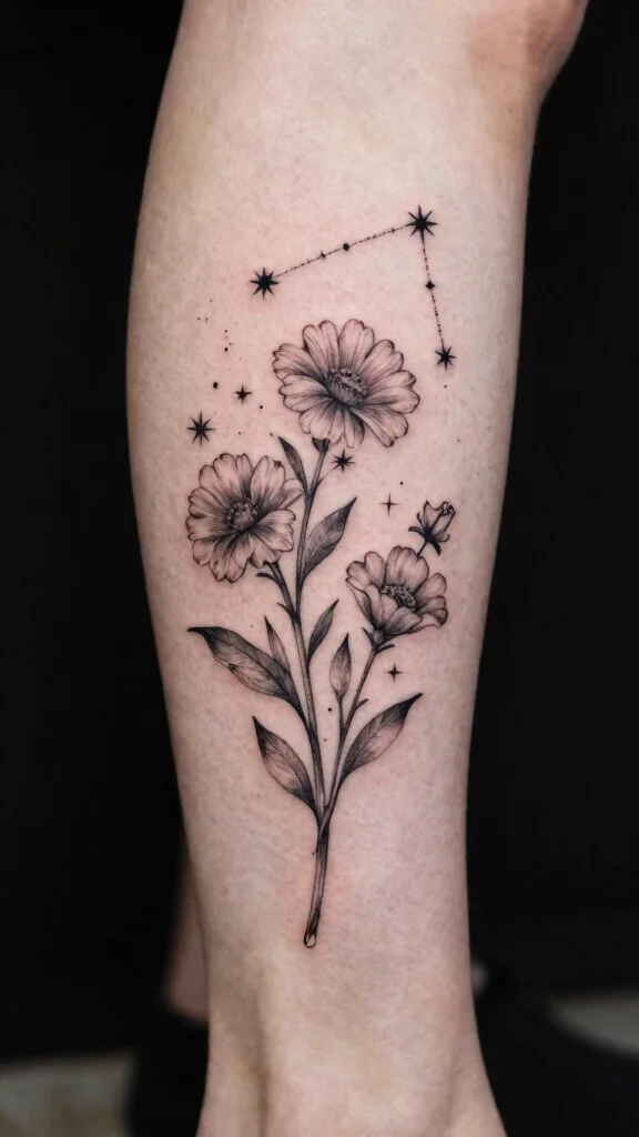 – Best for: Individuals who want to merge floral symbolism with astrology in their leg tattoos.