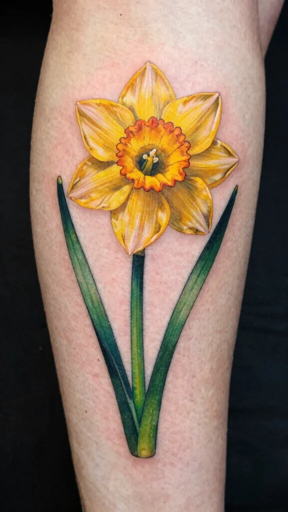 A daffodil tattoo captures the essence of hope and renewal, brightening your leg with its vibrant beauty.