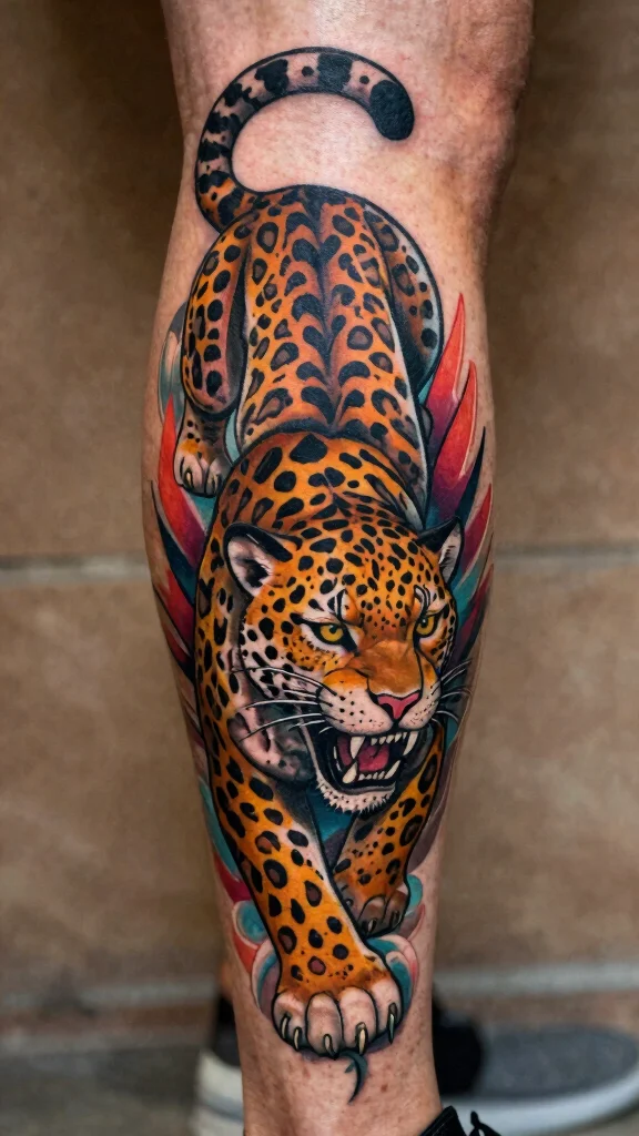 Leg tattoos of jaguars are striking and meaningful, perfect for those wishing to embody strength and courage. The placement allows for larger designs that can be enhanced with surrounding elements like foliage or symbolic imagery, creating a cohesive and eye-catching piece.