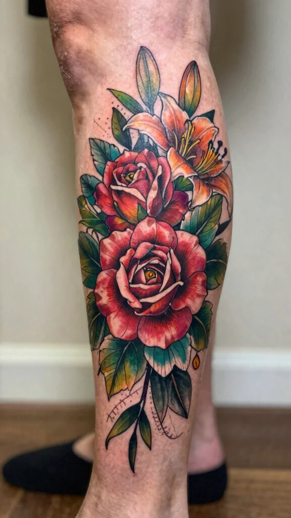 Floral motifs are prevalent in Chicano tattoos, often enhancing other designs or standing alone as beautiful art pieces. Roses, lilies, and other flowers can be intricately detailed, showcasing vibrant colors that bring life to the leg.