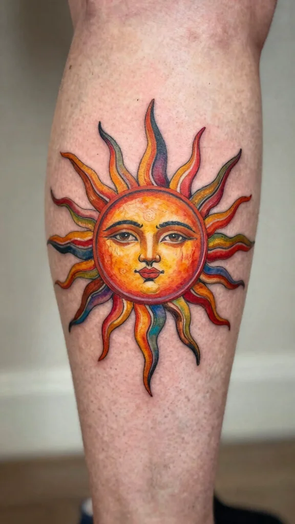 This design can be further enhanced with elements like flowers, geometric shapes, or clouds, creating a rich tapestry that tells a unique story. The sun tattoo is often placed on the upper thigh or calf, where it can shine prominently.