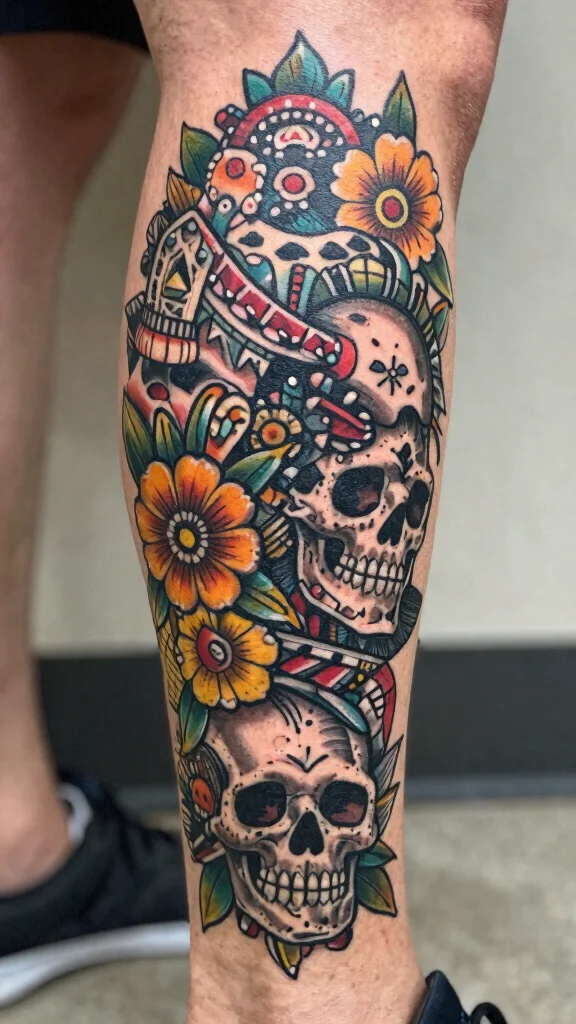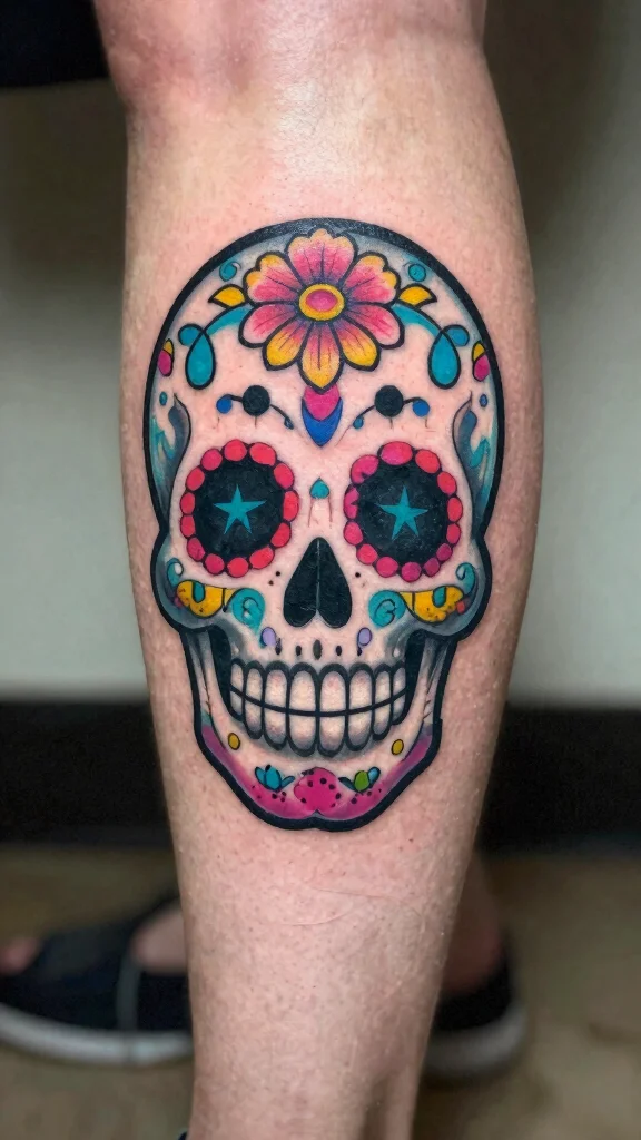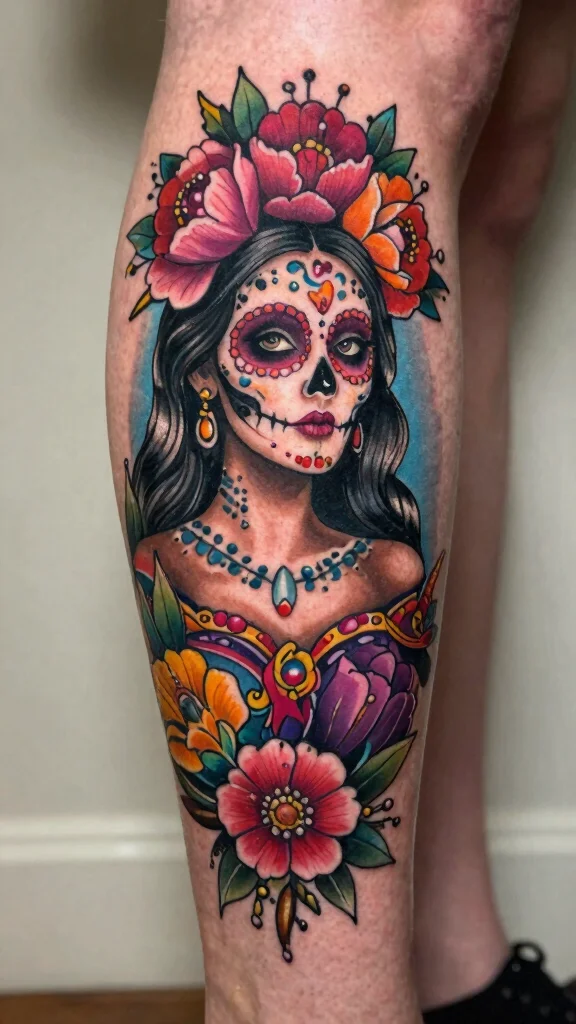 You can incorporate sugar skulls into larger sleeve designs or showcase them as standalone pieces on the calf. The vivid colors create a stunning contrast against the skin, making the tattoo eye-catching and profound. Adding personal touches like names or dates can enhance its emotional depth.