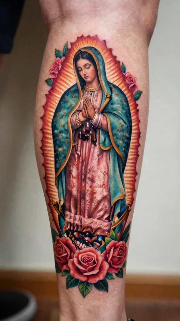 A leg tattoo of La Virgen can be a powerful statement piece, particularly on the upper thigh or calf for visibility. Adding personal elements like names or dates can deepen your connection to the artwork, allowing for customization to match your style.