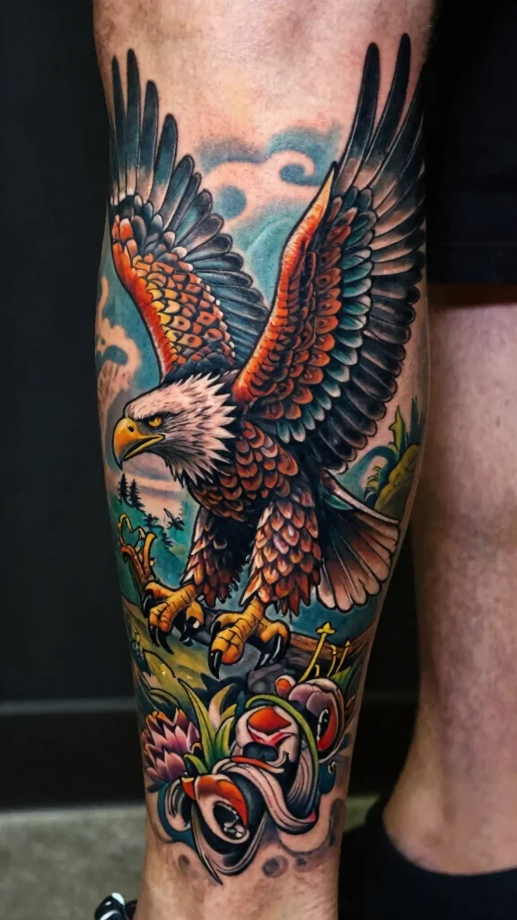 An eagle tattoo on the leg can be striking, especially when done in full color or bold black ink. This design is ideal for those wishing to express their inner strength or connection to their heritage, with the option to add smaller details like stars or other symbols for personalization.