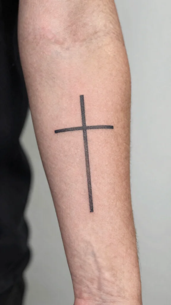 A simple cross tattoo represents faith, hope, and resilience, making it a timeless choice for many. With clean lines and minimal detail, this tattoo can be placed anywhere on your arm, emphasizing its personal significance. Its understated design allows it to either stand alone or complement other tattoos beautifully.