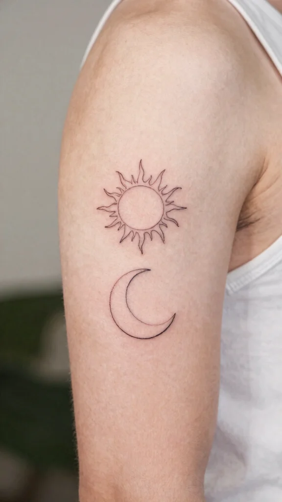 The minimalist sun and moon tattoo symbolizes the balance between light and dark, making it a poetic choice for many. Featuring a simple line art style, this design signifies harmony and duality in life. Its elegant simplicity allows it to blend seamlessly with other tattoos or stand alone as a significant piece.