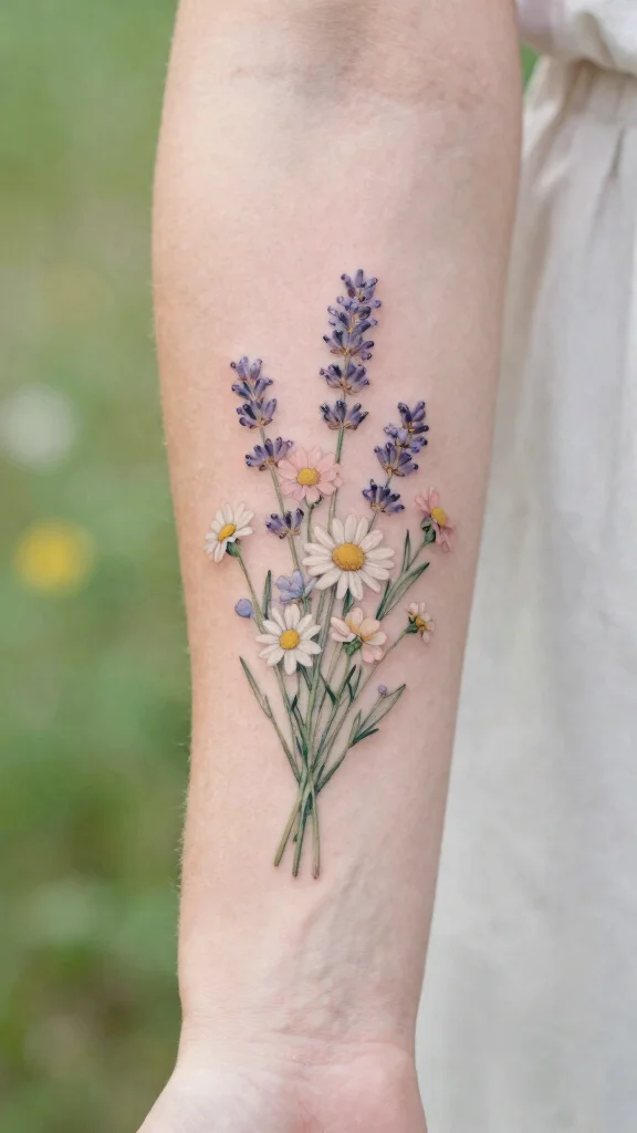 To personalize your wildflower tattoo, consider how you want it placed. Whether it wraps around your wrist or flows down your forearm, the scattered arrangement invites creativity. Explore different flower sizes and soft color palettes to enhance its delicate charm.