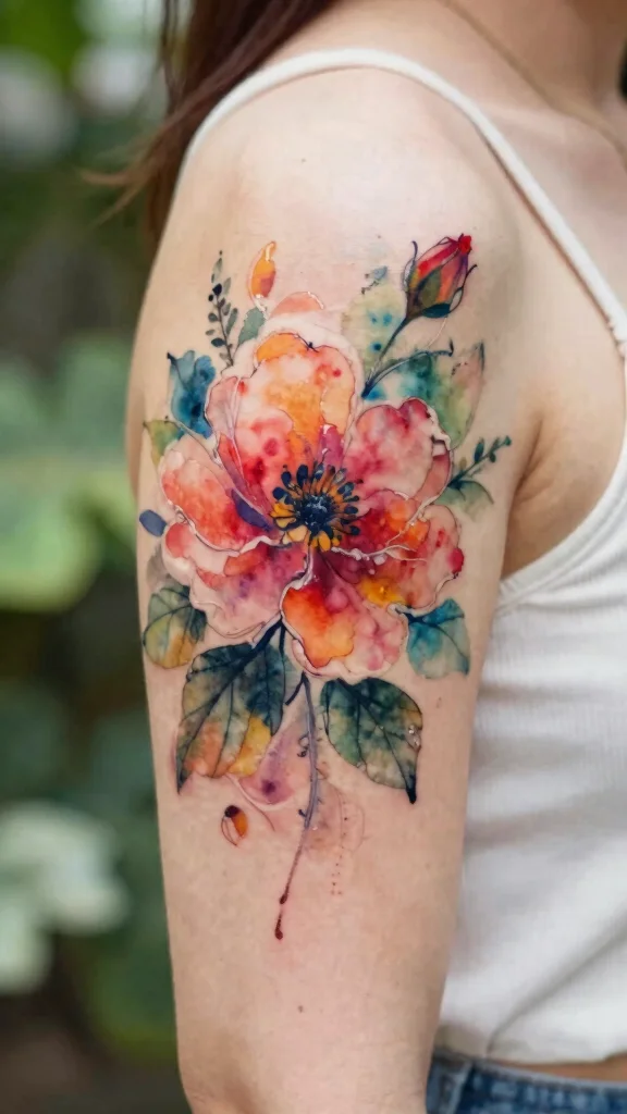 Watercolor tattoos are celebrated for their vibrant colors and flowing designs, and when flowers are incorporated, they create a dreamy effect. This design allows for artistic expression, blending flowers seamlessly with splashes of color that resemble a painting on your skin. It’s perfect for someone who loves creativity and uniqueness.
