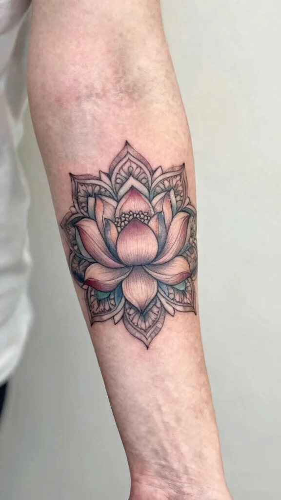 When choosing this tattoo, think about selecting a size that complements your arm without overwhelming it. Using calming colors can further enhance its spiritual significance. Collaborating with an artist experienced in mandalas ensures precision and intricate detailing.