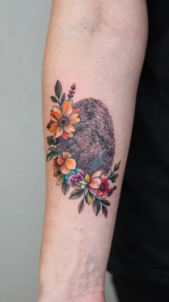For a truly personal touch, a floral fingerprint tattoo merges a unique fingerprint design with floral elements. This tattoo symbolizes individuality and can be tailored to represent something meaningful to you through the choice of flowers. It’s an excellent option for anyone celebrating their uniqueness.