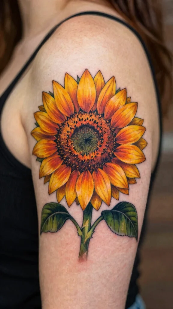 When considering this design, bright yellows and browns can enhance the sunflower’s cheerful vibe. Placement can vary; the upper arm or forearm are popular choices for visibility. You might also consider adding leaves or additional blooms for a fuller design.