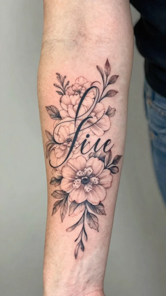 When considering this design, choose a font that reflects your style, from elegant cursive to bold scripts. Collaborating with an artist who specializes in both lettering and floral designs ensures your vision comes to life. Select colors that resonate with you, whether soft pastels or vibrant shades.
