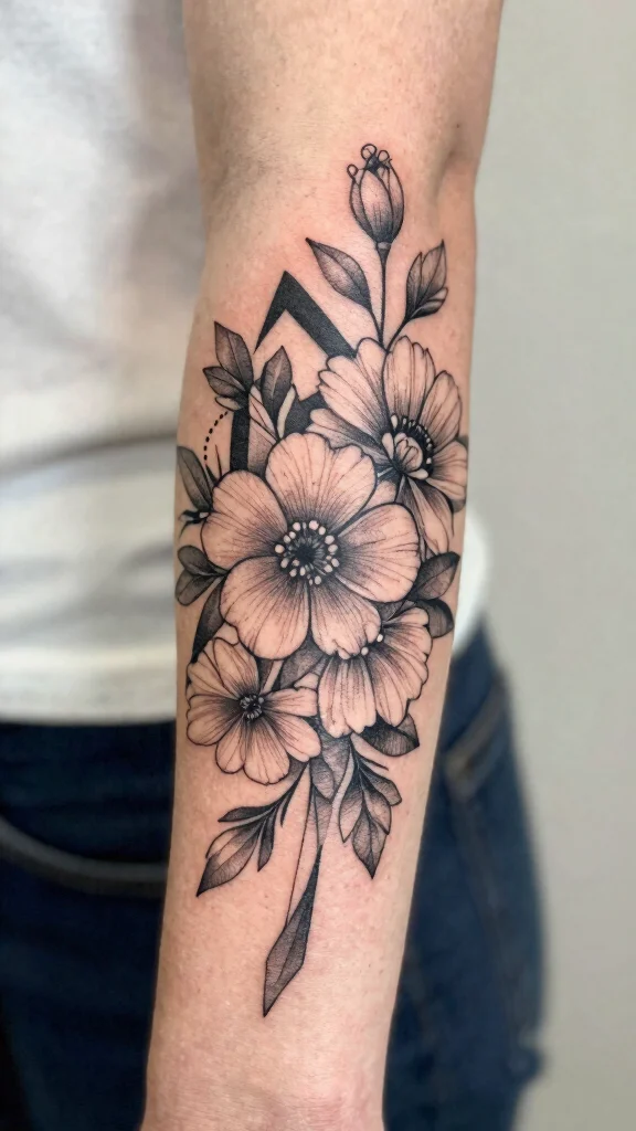 When considering this design, think about how to create balance between floral details and geometric shapes. Selecting a color palette that resonates with your personality can further enhance its impact, whether you prefer bold tones or soft pastels. Placement is also crucial; consider your arm’s natural contours to make the design flow beautifully.