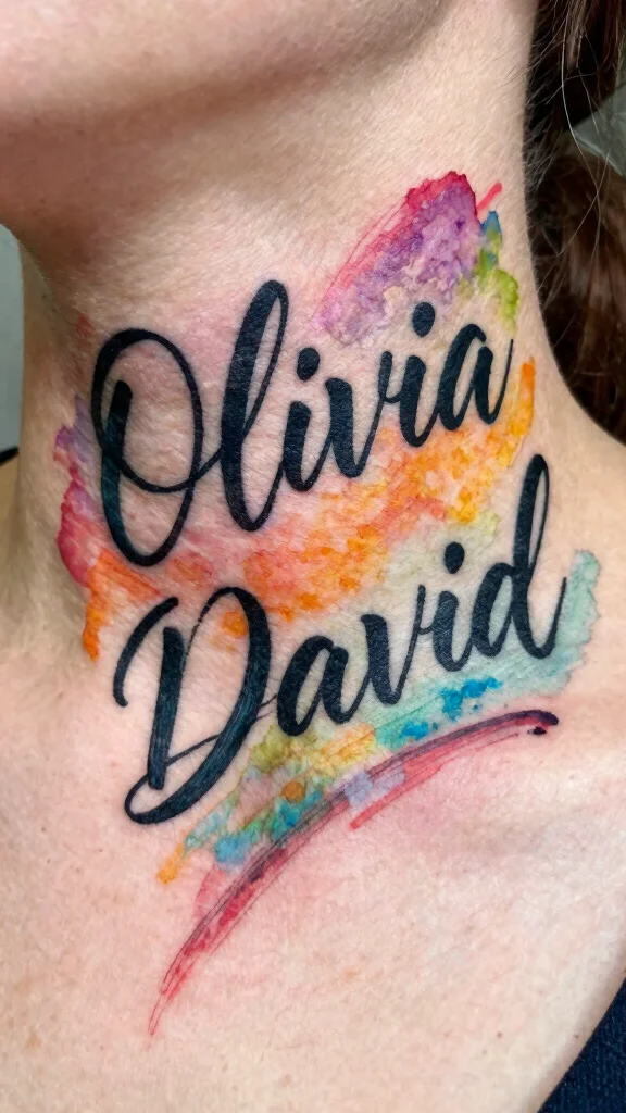 If you’re looking for something vibrant and artistic, a watercolor tattoo featuring your names can be a stunning choice. This style allows for creativity, showcasing splashes of color that resemble paint strokes. The names can be inked in bold fonts, surrounded by colorful watercolor splotches for a dynamic design.