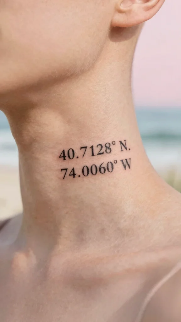 For couples with a shared significant location, geographical coordinates make a unique and meaningful tattoo. These designs often spark conversations filled with fond memories. Whether it marks where you met, got engaged, or a beloved vacation spot, the tattoo carries a rich story. Opt for a clean font and consider placing it on the side of the neck for visibility.