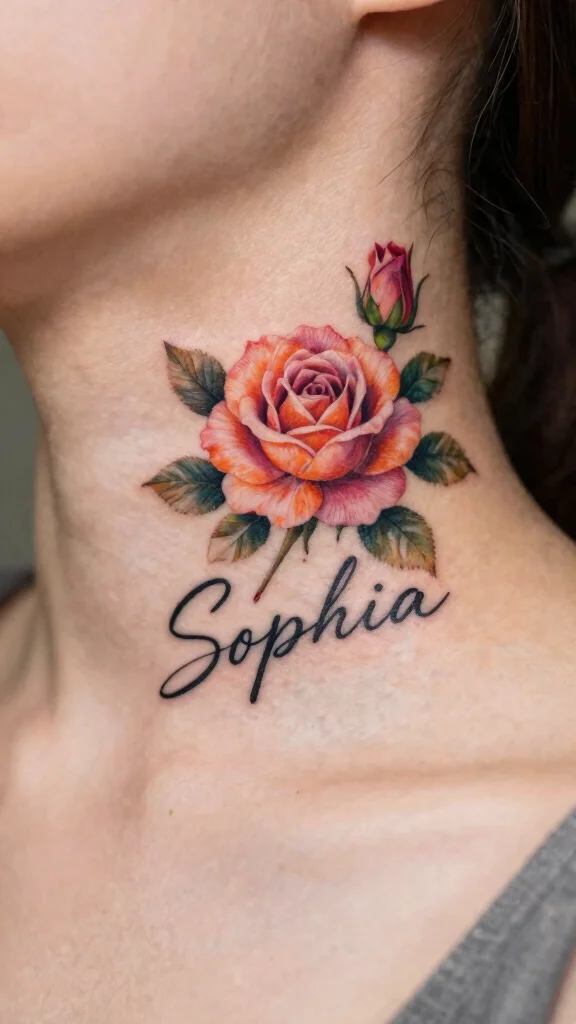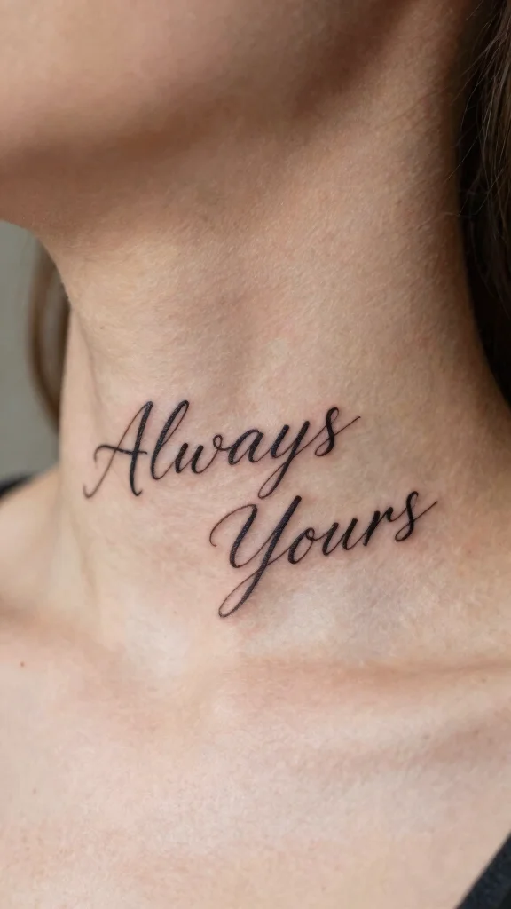 Neck tattoos heal differently and can be more prone to irritation due to movement and clothing. Aftercare basics include gentle washing, patting dry, and applying a thin layer of the recommended ointment. Avoid sun exposure, chlorine, and heavy sweating during healing, and wear soft clothing to prevent friction. Monitor for signs of infection and contact your artist if redness, swelling, or pain persists. Healing typically takes about 2-3 weeks for surface healing, with full integration taking longer. Once healed, protect the design with sunscreen to maintain crisp lines. Proper aftercare helps preserve name tattoo designs and keeps romantic neck tattoos looking fresh over time.