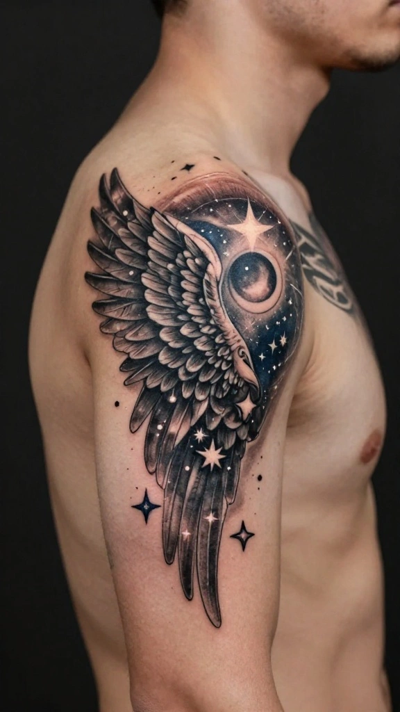 Incorporating celestial elements like stars, moons, or suns into your angel wing tattoo enhances its ethereal quality. These designs connect the wings to the cosmos, symbolizing guidance, dreams, and aspirations. Many men who feel a strong bond with the universe choose to integrate these elements, creating a design that resonates on multiple levels.