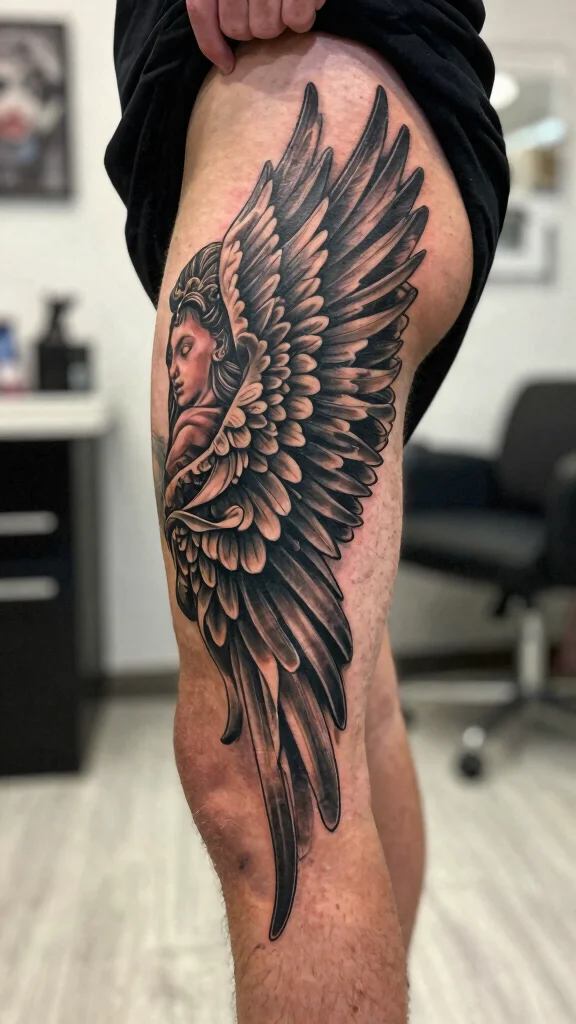 Integrating angel wings into a larger tattoo that flows from the thigh to the back creates a stunning, cohesive design. This style symbolizes transformation and interconnectedness, representing the journey from groundedness to elevation. Men who opt for this type of tattoo often seek something visually striking that tells a story about their personal evolution.