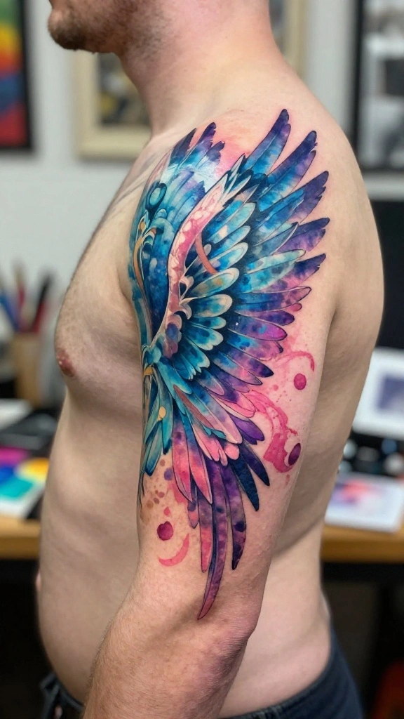 Watercolor tattoos bring a vibrant burst of color to traditional designs, making angel wings appear alive with artistic expression. These tattoos resemble a work of art on the skin, featuring splashes of color that mimic the fluidity of watercolor. Watercolor angel wings symbolize creativity and freedom, ideal for those who appreciate the beauty of artistic expression.