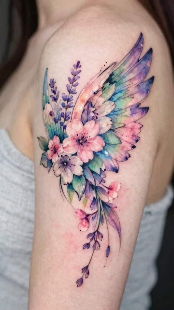Looking for a tattoo that captures the essence of freedom? Ethereal watercolor angel wings are a stunning choice that blends vibrant colors with delicate floral elements. The soft hues can range from gentle pastels to bold, eye-catching shades, creating an artistic display that feels alive and enchanting.