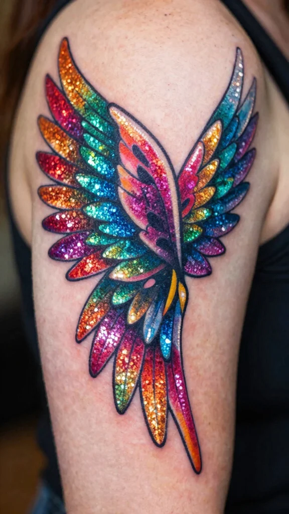 If you love sparkle, glittering angel wings are a dazzling choice! This design incorporates elements that mimic the shine of glitter, adding a fun and extravagant touch to your tattoo. The wings can shine with shimmering colors or be accented with strategically placed gems, making a vibrant statement.