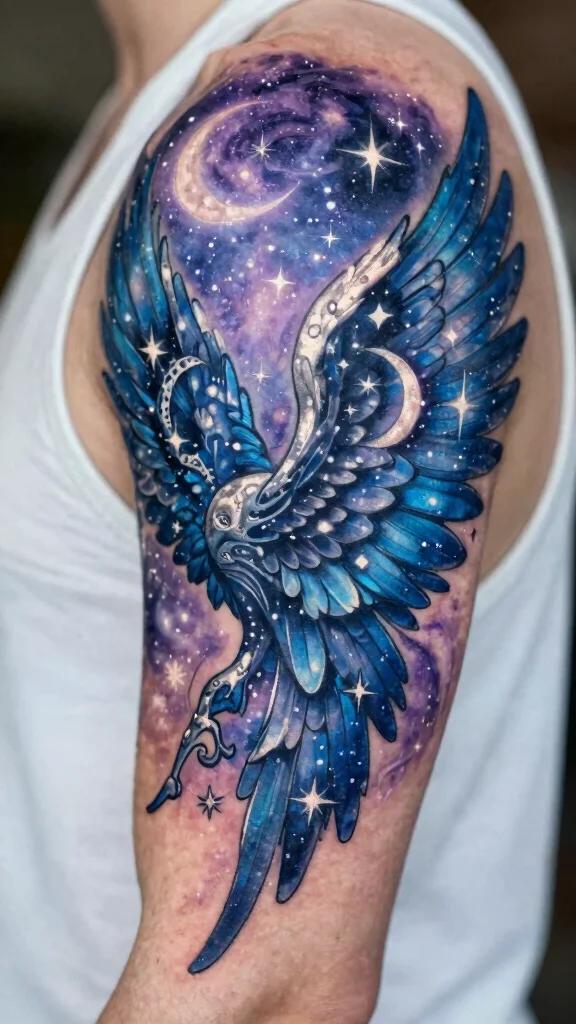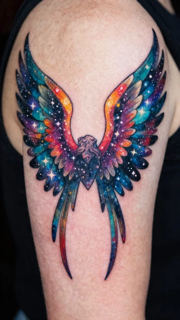 Cosmic angel wings are a mesmerizing tattoo choice that connects you with the universe. These designs incorporate celestial elements like stars and galaxies, intertwined with angelic wings for an ethereal effect. Expect vibrant colors reminiscent of nebulae, creating a stunning visual experience on your skin.