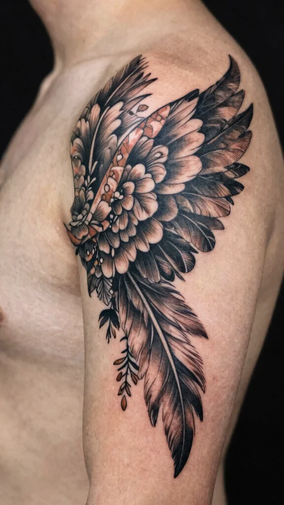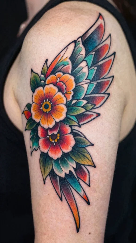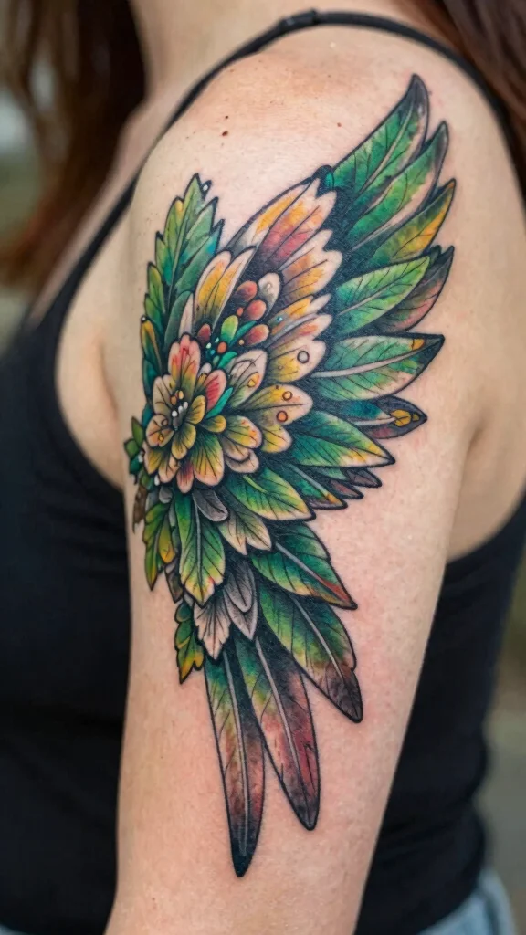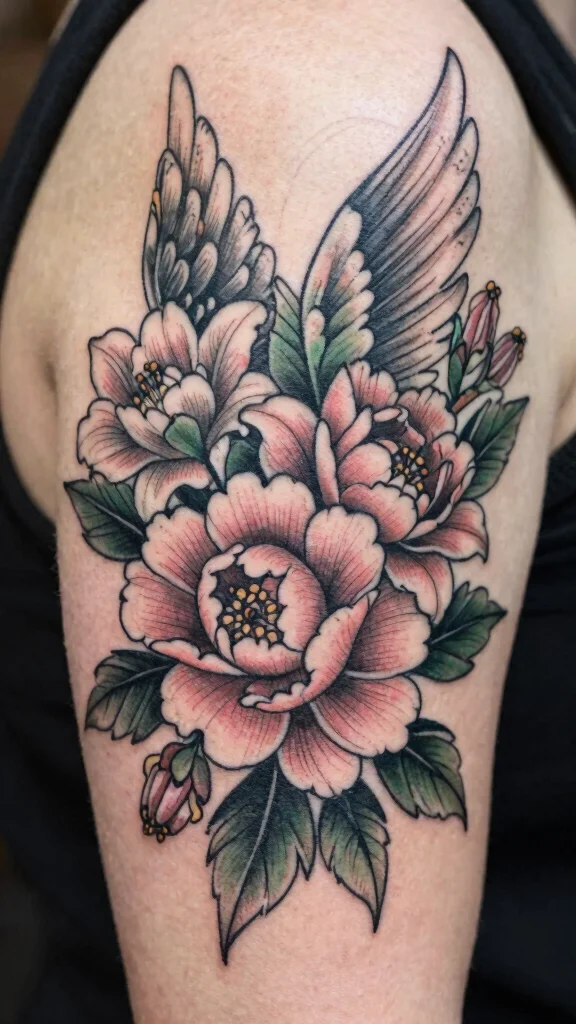 Work with a skilled artist to blend wings with feminine tattoo ideas like floral accents or script for a cohesive look.