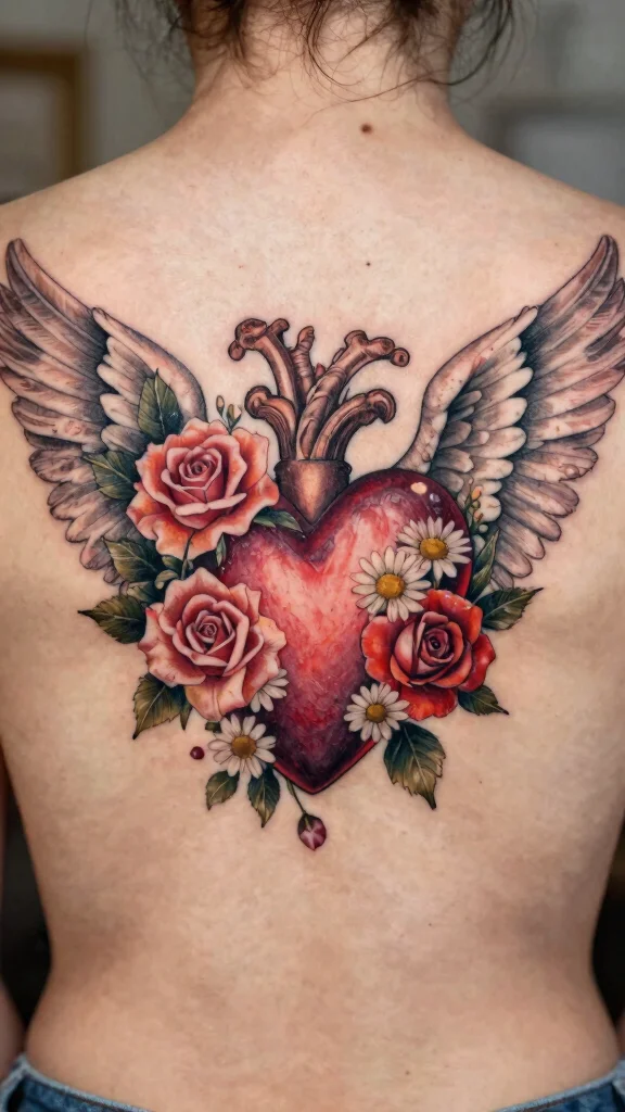 Imagine a tattoo that combines angel wings with the beauty of flowers — that’s the floral winged heart. This design symbolizes love and freedom, making it a heartfelt choice for many. The image typically features wings enveloping a heart, adorned with flowers like roses or daisies, creating a stunning visual narrative.