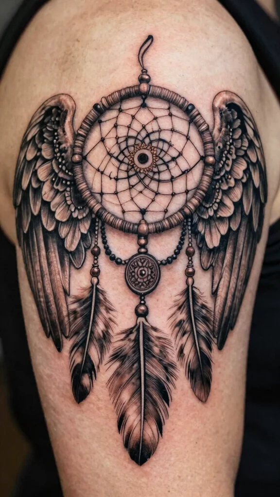 Dreamcatchers are symbols of protection, making them an ideal match for angel wing tattoos. By incorporating a dreamcatcher into a wing design, you create a beautiful piece that combines aesthetics with cultural significance. The wings can gracefully wrap around a dreamcatcher, adorned with feathers and beads, enhancing the overall harmony of the piece.
