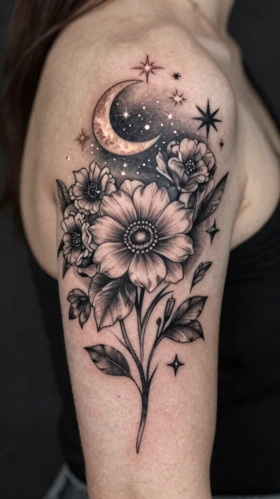 Select colors that resonate with your preferences—dark tones can create a dramatic effect, while lighter hues can impart a dreamy vibe. Collaborate with your tattoo artist to ensure a natural flow between the floral and celestial designs.