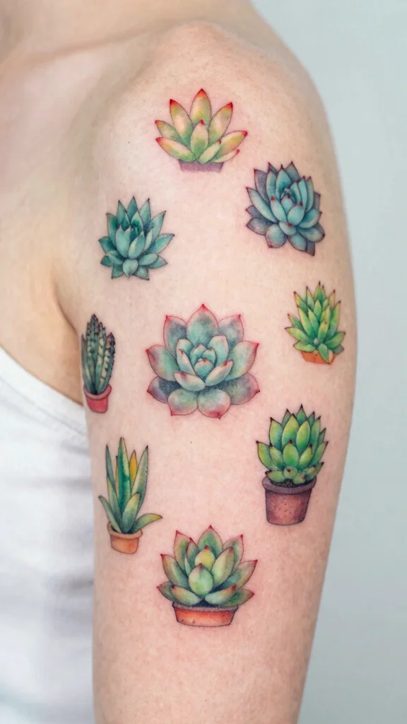 Using soft greens and muted pinks can create a natural look, or you can stick to a monochromatic palette for a sleek appearance. Place the succulents to appear as if they grow together, effectively camouflaging the older tattoo beneath.