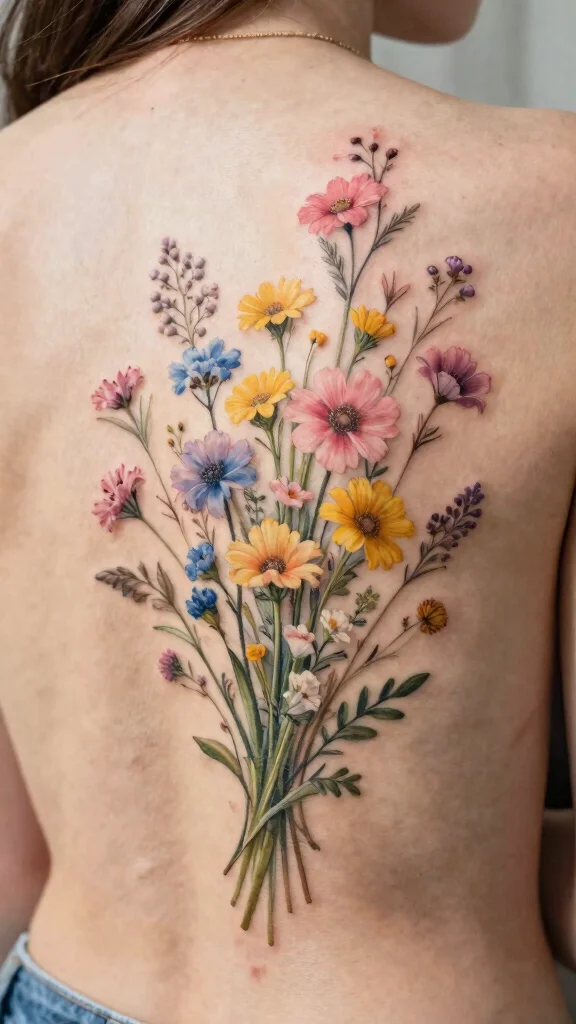 Start by selecting flowers that resonate with you, like your birth month flower or ones that hold special memories. Add varying colors to create a lively, eye-catching piece. Discuss with your tattoo artist how to position the flowers for a seamless, organic design that complements your body’s curves.